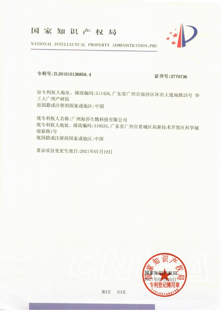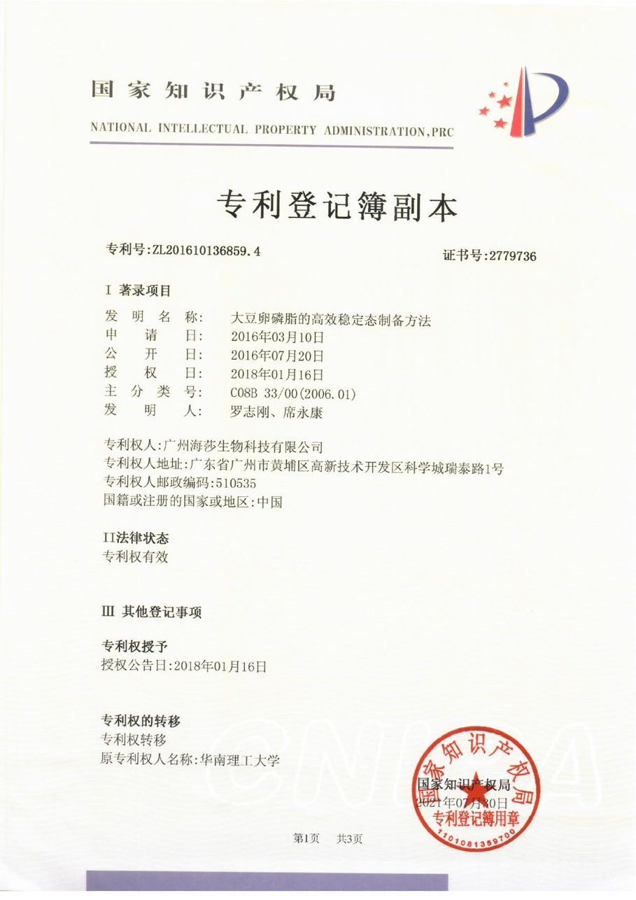 • 廣州海莎生物科技有限公司獲磷脂生產新專利,為開發高質量磷脂 產品提供了保障。